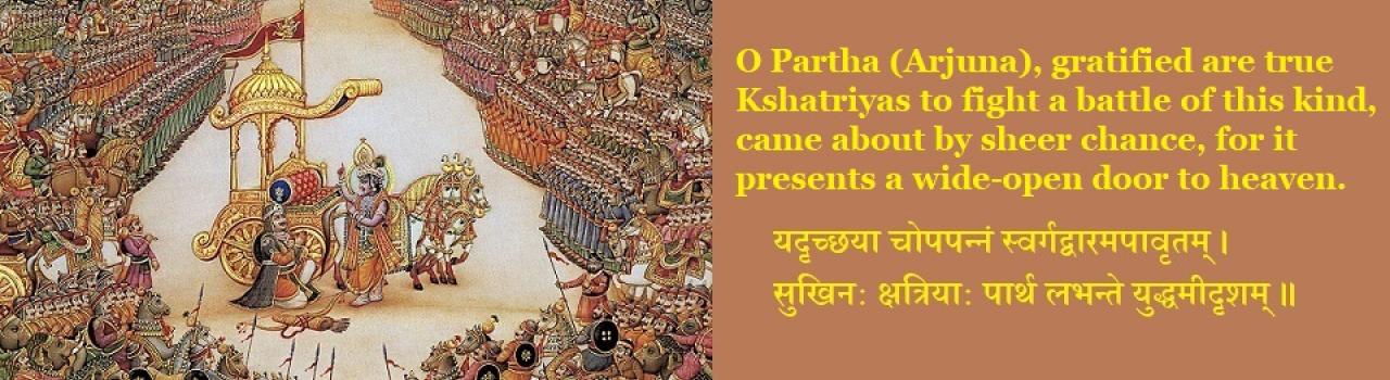 Many commentators conclude: Kṛshṇa taught Arjuna (or rather convinced him) why he should not hesitate to fight the battle, which was his duty as a warrior; Arjuna understood and overcame his reluctance to fight. His duty as a Kshatriya (member of the ruling class), was to fight (and kill, of course), whether it was to defend his kingdom or to re-capture the one that was snatched by treachery. A Gita term the commentators take advantage of is svadharma. Every person has his/her personal duty (svadharma), defined by nature, and one should not hesitate to perform his/her genuine duty, at whatever cost it takes. Arjuna’s svadharma was to fight battles! We find such interpretations very often, defeating the very doctrine of the Bhagavad Gita.