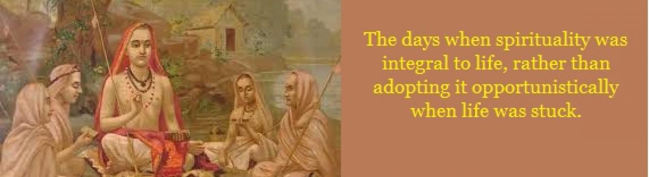 There was a time in India, maybe elsewhere too, when the basic curriculum of young pupils included spiritual studies. They learned Vedanta, the branch of study that taught the philosophy of life and the interpretation or the meaning of the world. The discerning students who absorbed the wisdom teaching could find their own answers when they faced the challenging questions of life. Spirituality was integral to life in those days rather than adopting it opportunistically when life was stuck.